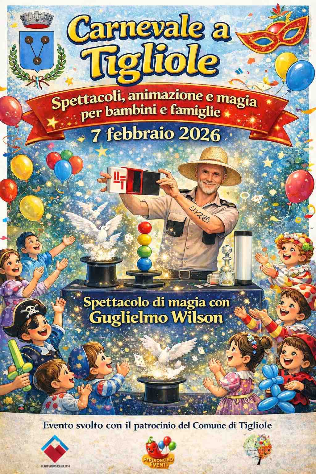 Guglielmo Wilson con i suoi molteplici personaggi è un artista poliedrico in grado di stupire grandi e piccini. I suoi show con pappagalli e colombe lo hanno reso uno dei più richiesti intrattenitori del nord Italia