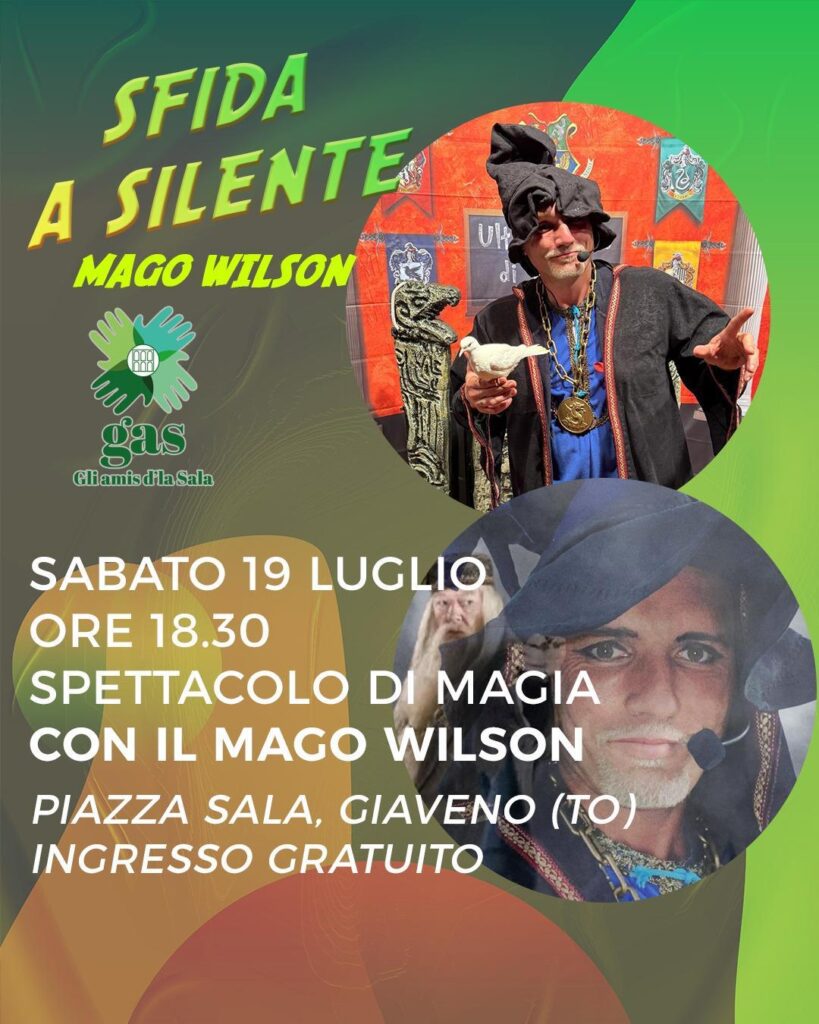 INGRESSO LIBERO Dove ? Piazza Sala – Giaveno (TO) Quando ? 19 luglio 2025 – show ore 18,30 Adatto ad un pubblico di famiglie. Powered by GliAmisD’laSala e Nuova Pro-Loco Giaveno