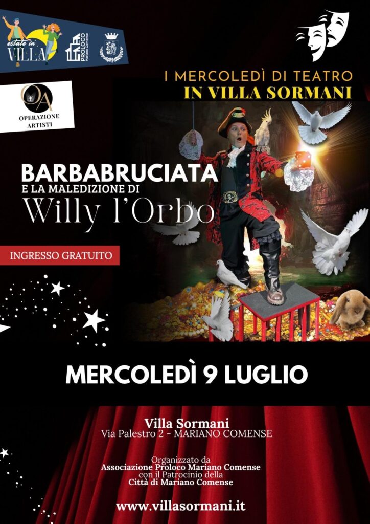 INGRESSO LIBERO Dove ? VILLA SORMANI – Mariano Comense (CO) Quando ? 9 luglio 2025 – show ore 20,30 Adatto ad un pubblico di famiglie. Powered by OPERAZIONE ARTISTI & PRO-LOCO Mariano Comense